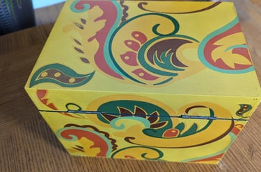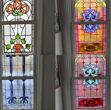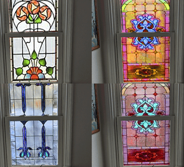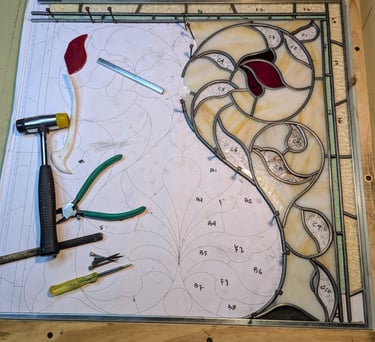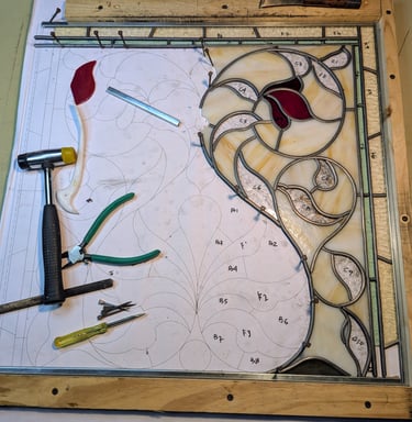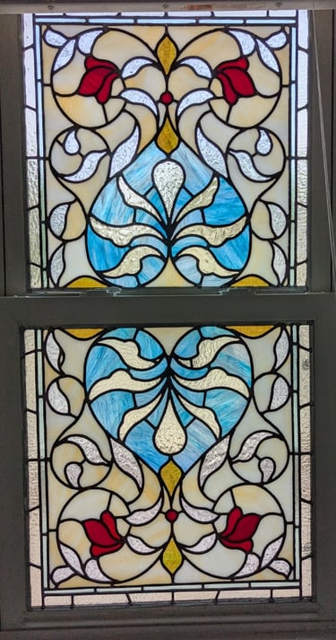 Client wanted a window that emulated the design of the recipe box, obscured her view of a neighbor, and greeted her with color every morning.